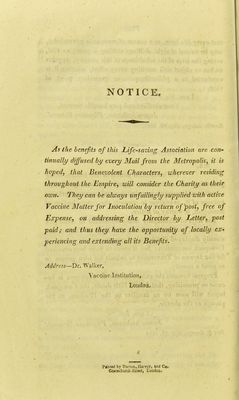 London Vaccine Institution : for inoculating and supplying matter, free of expense. Patronized by His Majesty's ministers, members of both houses of Parliament, the Hon. the East India Company, and the Corporation of the City of London. Established in 1806, and supported by voluntary contributions.