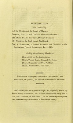 London Vaccine Institution : for inoculating and supplying matter, free of expense. Patronized by His Majesty's ministers, members of both houses of Parliament, the Hon. the East India Company, and the Corporation of the City of London. Established in 1806, and supported by voluntary contributions.