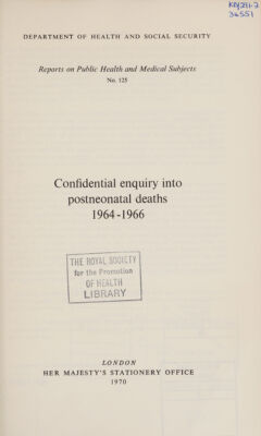 ![DEPARTMENT OF HEALTH AND SOCIAL SECURITY Reports on Public Health and Medical Subjects No. 125 Confidential enquiry into postneonatal deaths 1964-1966 ¥ LONDON HER MAJESTY’S STATIONERY OFFICE PRICE 6s 6d [32$p] NET](https://iiif.wellcomecollection.org/image/b32183513_0001.jp2/full/800%2C/0/default.jpg)