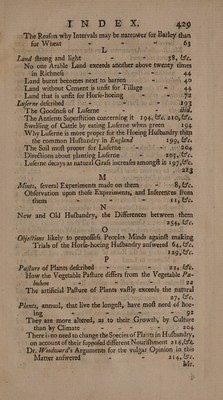 The horse-hoeing husbandry: or, an essay on the principles of vegetation and tillage. Designed to introduce a new method of culture; whereby the produce of land will be increased, and the usual expence lessened. Together with accurate descriptions and cuts of the instruments employed in it / By I.T. [Jethro Tull].