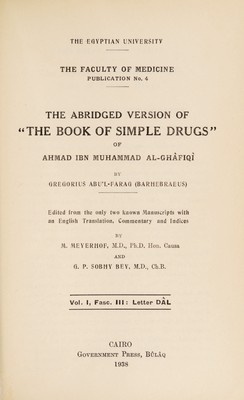 The abridged version of "The book of simple drugs" of Ahmad ibn Muhammad al-Ghâfiqî / by Gregorius Abu'l-Farag (Barhebraeus) Ed. from the only two known manuscripts with an English Translation, commentary and indices, by M. Meyerhof, G.P. Sobhy.