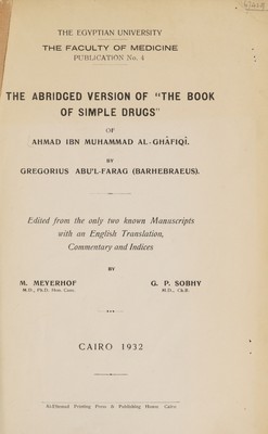The abridged version of "The book of simple drugs" of Ahmad ibn Muhammad al-Ghâfiqî / by Gregorius Abu'l-Farag (Barhebraeus) Ed. from the only two known manuscripts with an English Translation, commentary and indices, by M. Meyerhof, G.P. Sobhy.