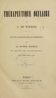 Thérapeutique oculaire / par L. De Weckler ; leçons recueillies et rédigées par Masselon.