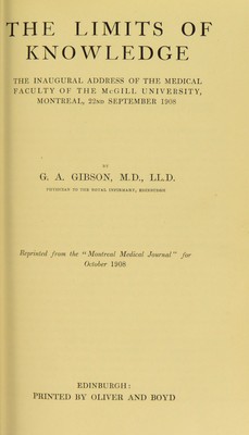 The limits of knowledge : the inaugural address of the Medical Faculty of the McGill University, Montreal, 22nd September 1908 / by G. A. Gibson.