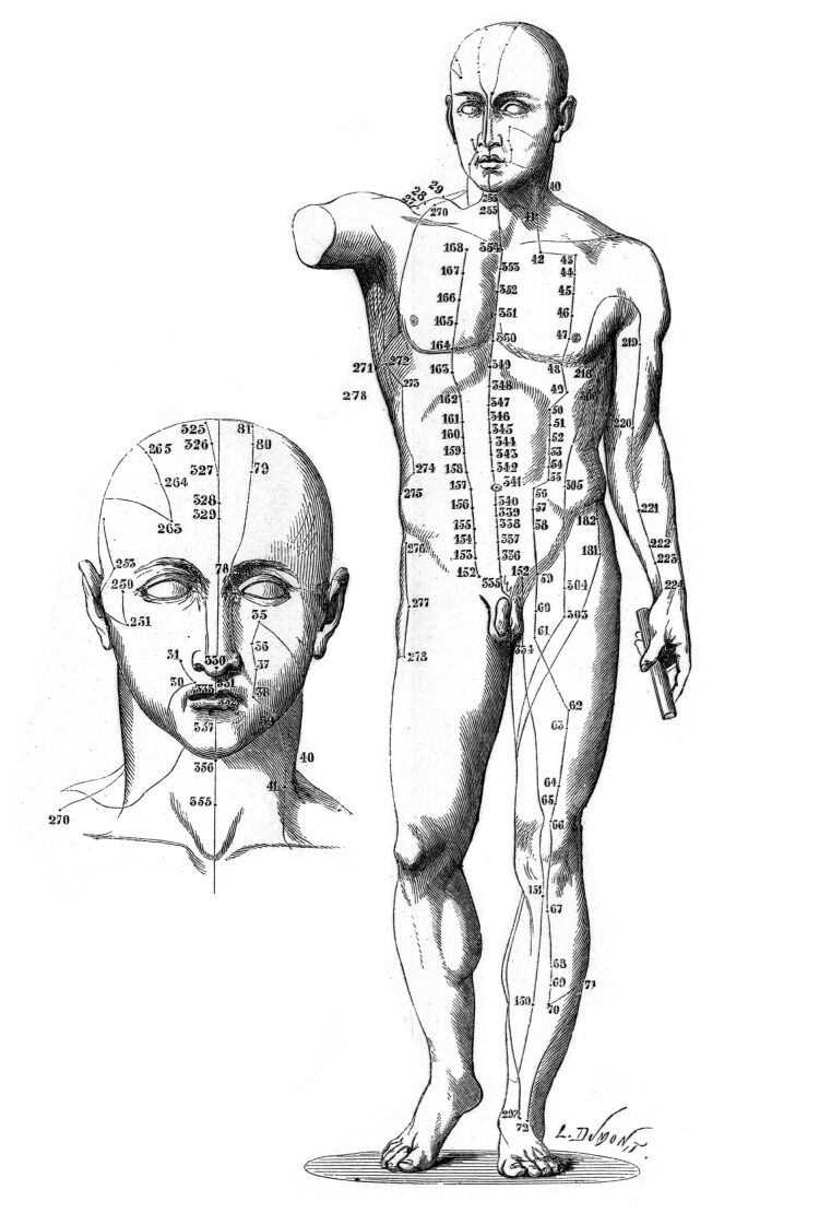 M0014704: Illustration of a human figure showing points for application of acupuncture needles. Public Domain Mark. Source: Wellcome Collection.