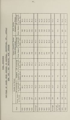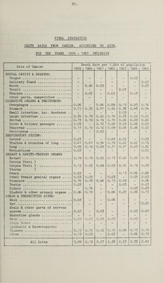 ![DEATH RATES FROM CANCER, ACCORDING TO SITE, FOR THE YEARS 1959 - 1965 INCLUSIVE Site of Cancer Death Rate per 19000 of p 1959 1 i960 | 1961 | 1962 8 1963 opul&t 1964 ion 1965 BUCCAL CAVITY & PHARYNX? j lQ]QgUe 00®0‘s'00* 0000€>00000000#©00o| — a> = «*=• 0o03 CT3 1 l3cl ll GlaX3 00000000*000000000 — -» — — — 0o03 | oooooooo®oooo®oooooooo«oooo — O0O6 0o03 — — =» 0o03 | TOXXSll oooooooooo©ooooo©oooooo»oo — — — - 0 0 0 \j»i = t~~i 1 IPtiaryHX OOOOOOOOOOOOOOGOOO ©OOOOOO 0o03 • 0o03 CD 0o03 Other parts9 unspecified 00000000 - - e=» =■ = c= => | j DIGESTIVE ORGANS & PERITONEUM? O0SQ£)£l 3, gUS ooooooooooooooooocoooo O0O6 ! O0O6 0o09 Od3 0o03 O0I6 5 tomach ooooooo©ooooqooooo*©ooooo Oo73 Oo35 0o4y 0o30 Oo38 0o48 0o54 Small intestine 5, inc0 duodenum 00 — <= - 0o03 Laig0 int0stin0 ooooooooooooo©ooo Oo35 0.19 0o22 0d9 0.28 0o22 0o22 R O 0 tum oooooooooooooooooooooooooo 0o19 Ode 0d9 0d9 O0O6 0o09 O0O6 | Liver & biliary passages 00ooo0oo 0o09 — 0o12 j 0o09 0o03 0o06 0o03 Pancreas 00*000000000000000000000 Od3 OolO 0o12 0o09 O0O6 0o06 0o03 JPOX^i^’On^ CiDl 00000000000000000 ®oooo => — 0o03 — - — “ ! RESPIRATORY SYSTEM? Xjciy ^nX OOOOOOOOOOOOOOOOOOOOOOOOOO 0o03 — — 0o03 0o03 - O003 Trachea & bronchus of lung „ 0«»0 o 0 o04l 0o4l 0o34 0o19 0o22 Oo 22 O019 Lung 0000000000©0000000000»0 OOOOO O0C9 OolO 0o09 0o3l 0o31 0o25 0o32 M^dx^si^xiiuin G000000«0®00000000000 BREAST & GENITO-URINARY ORGANS O0O3 * 053 ** *• 0o03 BjL^OclSi OOOOOOOOOOOOOOOOOOOOOOOOOO 0d9 0d9 0o25 0o13 0o22 0o22 OolO Cervix Uteri ) C037JpUS Uteri ^ OOOOOOOOOOOOOOOOO 0oi3 0o03 0o09 0o03 0ol6 o\ 0 O 0o03 Uterus ) 000 • OOOOOOOOOOOOOOOOOOOOOOO O0O3 — — — 0o13 O0O6 0o06 Other female genital organs 0oo o o O0O3 O0O3 - 0o03 - 0o03 0o03 Prostate OOOOOOOOOOOOOOOOOOOOOOOO 0oi6 OolO O0O6 0o13 0o09 — 0o06 tlS 00000000000000000000000000 0o03 — — i 0o03 — 0o03 Rldne^ ooooooooo©ooooooo«®o©e • o © o ax. 0o16 - 0o03 0o03 Bladder & other urinary organs 0o O0O6 OolO - 0o06 Oo25 O0O6 0o13 OTHER & UNSPECIFIED SITES? SRm OOOOOOOOOOOCQOOOOOOOOOOOOOOO 0o03 — - 0o06 — - - 6 OOOOOOOOOOOOOOOOOOO0OOOOOOOOO Brain & other parts of nervous 0o03 System 000000®00®0000000000000000 0o03 a 0o03 - 0o03 0o03 Endocrine glands 0000000000000000 - - - “ - Bo A0 OOOOOOOOOOOOOOOOOOOOOOOOOCOO 0o03 0o03 0o03 0o03 - 0o03 <= LympL Nodes oooooooooooooooo©oooo - - - c=> => - Lymphatic & Haemotopietic 1XSSU6S OOOOOOOOOOOOOOOOOOOOOOOOO 0d3 0o12 0 0 (V Go 16 0o09 0o13 OolO 0 t *-L er ooooooooooooooooooooooooooo ! 0oi3 0o03 = 1 0o03 - O0O6 ■.. rrjM 0o13 All Sites 3o09 l_ 2o13 2o2? 2o3S 2 0.53 2o35 2o43 1](https://iiif.wellcomecollection.org/image/b29899801_0043.jp2/full/800%2C/0/default.jpg)