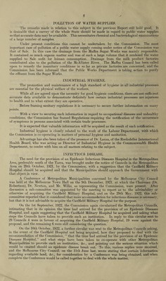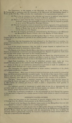 ![The Commission, at the request of the Honorable the Acting Premier, Sir William McPherson, had a conference with the Chairman of the Melbourne and Metropolitan Board of Works on the 15th May, 1923, and after due consideration of his representations resolved :— (1) That it has no objection to the collection and removal of nightsoil being imposed on Councils provided that such duty is efficiently performed. (2) That it is urgent that the duty of disposal be at once undertaken by the Sewerage Authority owing to the unsuitability of many of the sites for disposal at present in use in several Metropolitan Municipal Districts. (3) That the Commission cannot recommend any further suspension of the proclamation of the Act unless an assurance be at once given by the Melbourne and Metropolitan Board of Works that it will at the earlist possible moment proceed to carry out the duty as to the disposal. (4) That the foregoing resolution be communicated to the Chairman of the Melbourne and Metropolitan Board of Works, also to the Minister of Public Health. On the 29th June, the Melbourne and Metropolitan Board of Works informed the Acting Premier that it was prepared to proceed at the earliest possible moment to carry out the duty of disposal. Since that date the Commission has been informed by the Board that it is awaiting the passage of an amending Act which is, in its opinion, essential to enable it to carry out the work of disposal. it is of the utmost importance that the work of proper disposal of nightsoil from the metropolitan area should be undertaken without delay. The Deports of the District Health Officers show that as a general rule closets in the country districts are insanitarily constructed and maintained and that disposal of nightsoil is badly done and not kept under proper supervision by the Council’s Inspector. While no town other than those mentioned in the last Report has adopted sewerage, yet many Councils are inquiring into the question, and there is reason to believe that definite action will soon be taken in the case of three or four of the larger towns in the country. Septic Tank Installation.—In the case of individual premises septic tanks are being installed in many places in the outskirts of the Metropolitan Area and in country districts/ Some of these are not satisfactory, inasmuch as no provision is made for purification of the effluent before discharge into a street channel or elsewhere. The Commission has adopted Regulations to secure sanitary construction of the plants and adequate purification of effluent. Chemical Closets.—Many types of chemical closets are being put on the market by commercial firms, but al] are not giving uniformly successful results. In the case of that type in which a caustic alkali is used the results are satisfactory, provided the directions are faithfully complied with. There is, however, some difficulty in the innocuous disposal of the contents of the receptacles. The term “ chemical closet ” popularly connotes an appliance which provides means for converting the faeces and paper into a sterile liquid. Many of the so-called chemical closets are- in effect merely the ordinary pan-closet, to which is added a comparatively small quantity of disinfectant. If a sufficient quantity of disinfectant is added either in one lot or intermittently and provision made for intimate admixture with the faecal matter, no nuisance will arise. In any case, however, proper disposal of the contents must be carried out. If the area of premises is insufficient or the soil unsuitable for local disposal the contents of the pan must be disposed of in a similar manner to that which obtains in regard to double-pan service, OFFENSIVE WATER-COURSES. Action has been taken by the Commission to prevent nuisance arising from the disposal of drainage from the offensive trade premises on the Maribyrnong River. As stated in the last Report, the offensive water-courses in the Metropolitan Area can only be maintained in a sanitary condition by new enabling legislation. The Commission notes with pleasure that the Metropolitan Streams and Drainage Bill has been passed by Parliament, and trusts that no time will be lost by the Melbourne and Metropolitan Board of Works, which has been intrusted with the administration of the Act, in taking the necessary action to permanently remedy the insanitary conditions of certain streams which have long been a reproach to the metropolis.](https://iiif.wellcomecollection.org/image/b31479030_0007.jp2/full/800%2C/0/default.jpg)