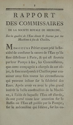 Rapport des Commissaires ... sur la qualité de l'eau élevée & fournie par les machines à feu de Chaillot.
