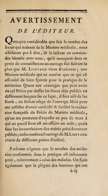 Précis de la matiere médicale. Contenant les connoissances les plus utiles sur l'histoire, la nature, les vertus & les doses des médicamens, tant simples qu'officinaux, usités dans la pratique actuelle de la médecine, avec un grand nombre de formules éprouvées. Traduction de la second partie du Précis de la médecine pratique, publiée en Latin [i.e. 'Synopsis universae praxeos medicae'] / Par M. Lieutaud.