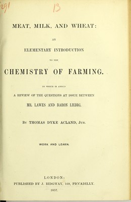 Credit: Meat, milk, and wheat : an elementary introduction to the chemistry of farming : to which is added a review of the questions at issue between Mr. Lawes and Baron Liebig / by Thomas Dyke Acland, jun. Source: Wellcome Collection.