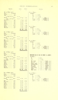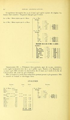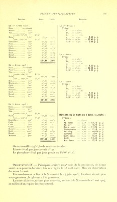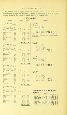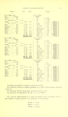 ![Ingcslas. Azole. Pli^O^ Le 10 Mars 1902 : Eau à volonté Sucre 28»'' Vin 3o' ('croûti;.'J4''.S8 25'',40 Pain] 427s-- 8K^(il i,(iG (mie. 332='-, 12 0-'',21 Pois 35'' is'',23 o,3i Café 3o5'' o»'',i5 « Lentilles 29»' i',09 o,i) Œufs io6'' 2% 12 0,44 Beurre lOO'' o»'', 11 >i Lait 490-'' 2S'',82 0,97 Bœuf 90Ï'' 2ï',97 0,43 Veau 8i''' 2',56 o.iG Lf. II Mars 1902 : Eau à volonté Sucre 28''' Vin So icniùle. lUa^^'.So 25',G I Pain; 45o-'' 9^lo 1,75 (mic . . 347 = ',!,) C^' jy Haricots 5o'' 2-',04 0,46 Café 3o-'' 0'=', i5 » Œufs 113-'' 2S',2G 0,47 Beurre Sa-'' os'.oG » Lait 490'' 2S'',82 0.97 Bœuf '78-'- 2S'-,58 0,37 Mouton 70-'' i^'.gi 0,37 20'.92 4!39~ Le 12 Mars 1902 : Eau à volonté Sucre i4'' Vin.. 30-^ écroule. 80-'' 2-',03 Pain< 357»' 7ï',20 1,39 V mic.. . 277 - fi', i 7 Riz 3os'' 0'',32 i,(j3 Café lf)'' o-'',075 » Œufs 107S'' 2S'',i4 0,14 Beurre fio^'' o»''',o5 Lait 49O' 2'',82 0,97 Bœuf gos' 2S'',97 0.43 15',575 J26 Excrelas. Lj; 10 Mars : Urine : Y 1,019(5 A = — 1,17 a 1,59 = 2,71 p. j. Urée - 13,58 = 23,15 p. j. AzH-' 0,58 = 0,98 p. ]. Az. total = 8,11 = 13,84 p. j. Ac. ur. = o,G4 = 1,10 p. j. Carb. total — 7,70 13.U p. j. Phosphates 1,29 = 2,20 p. j. Ph. org. 0,023 0,04 p j. Sulfates 1,81 3,10 p. j. Suif. conj. — 0,15 = 0.25 p. j. NaCl 8,8 = 15.00 p. j. 3,32 p. j. Mat. terii. 2,07 = M M A H S 1 Y I i5o 1,021 A — 1,38 a 1,47 1,61 p. j Urée '4,97 17.21 p. i AzIF 0,G2 0,71 p. j Az. total 8,72 10.03 p. j \c. ur. 0,78 0.90 p. j Carb. total 7,84 9,02 p. j Phosphates 1 ,GG 1,92 p. j Ph. org. 0,02G 0,03 p. j Sulfates 2,00 2.30 p. j Suif. conj. 0,19 0,21 p. i NaCl I 2,20 14,00 p. j Mat. torn. 1,77 2,03 p. j Le 12 Mars : Urine : V 83o''^ D„ 1,0173 A — 1,16 a 1,47 0.96 p j U rée 14,53 12,06 p. j AzH' 0,40 0,33 p. i Az. total 7,9G 6,61 p. j Ac. ur. 0,7c 0,60 p. i Carb. total 7.48 6,21 p j Phosphates 1.48 1,23 p. j Ph. org. 0,024 0.02 p. j Siilfales 2,28 1,90 p. j Su 11. conj. 0,20 0.16 p. j NaCl 8,1 6.72 p i 1.35 p i Mat. tcrn. 1,63 La femme accouche le l'i itiars à 4 heures du soir. Les matières fécales recueillies pendant les 11 jours d'observation pesaient I 5o.5''',7o. La moyenne d'azote fécal pour un jour fut de ()^',82; La moyenne de phosphore lut de (en Ph-Q''] ; Il y eut un vomissement le i3 mars au matin (lin de la journée du 1'2) Les matières vomies pesaient Soo grammes et contenaient Azote = 0,29; Ph^O' = 0,10; SO*II- = traces.](https://iiif.wellcomecollection.org/image/b21460656_1157.jp2/full/800%2C/0/default.jpg)