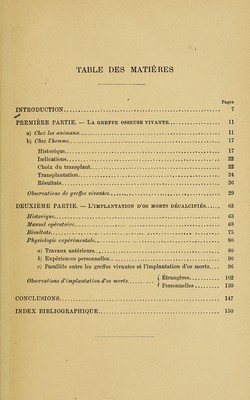 ![TABLE DES MATIÈRES Pages INTRODUCTION 7 PREMIÈRE PARTIE, — LA GEEFFE OSSEUSE VIVANTE 11 a) Chez les animaux 11 b) Chez Vhomme 17 Historique 17 Indications — 22 Choix du transplant 22 Transplantation. 24 Résultats 26 Observations de greffes vivantes 29 DEUXIÈME PARTIE. — L'IMPLAKTATION D'OS MORTS DÉCALCIFIÉS 63 Historique 63 Manuel opératoire 68 Bésultats 75 Physiologie expérimentale 80 a) Travaux antérieurs 80 h] Expériences personnelles 90 c) Parallèle entre les greffes vivantes et l'implantation d'os morts.... 96 Observations d'im2}lantation d'os morts \ '^ ( Personnelles 130 CONCLUSIONS 147 INDEX BIBLIOGRAPHIQUE 150](https://iiif.wellcomecollection.org/image/b2122657x_0011.jp2/full/800%2C/0/default.jpg)