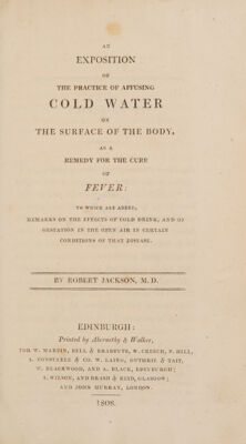 Credit: An exposition of the practice of affusing cold water on the surface of the body, as a remedy for the cure of fever: to which are added, remarks on the effects of cold drink, and of gestation in the open air in certain conditions of that disease / [Robert Jackson]. Source: Wellcome Collection.