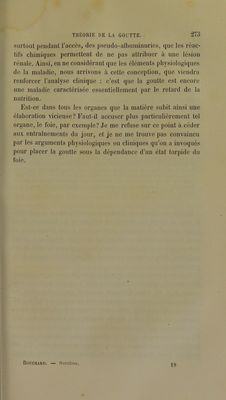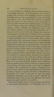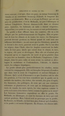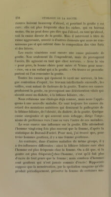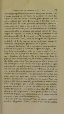 ![rieures boivent beaucoup d’alcool, et pourtant la goutte y est rare; elle est plus fréquente chez los riches, qui en boivent moins. On ne peut donc pas dire que l’alcool, en tant qu’alcool, soit la cause directe de la goutte. Mais il intervient à titre de cause aggravante, associé à d’autres éléments que nous ne con- naissons pas et qui entrent dans la composition des vins forts et des bières. Les excès vénériens sont encore une cause puissante de goutte. Non seulement ils l’engendrent, mais ils provoquent l’accès. Ils agissent en tant que choc nerveux. « Avec le vin (f pour père, la bonne chère pour mère et Vénus pour nour- « rice, on a un enfant qui a la goutte. » On trouve ce proverbe partout où l’on rencontre la goutte. Toutes les causes qui épuisent le systè me nerveux, la lon- gue contention d’esprit, les travaux intellectuels excessifs, les veilles, sont autant de facteurs de la goutte. Toutes ces causes produisent la goutte, en provoquant une détérioration vitale qui aboutit aussi au diabète, à la lithiase biliaire, etc. Nous refaisons une étiologie déjà connue, mais nous l'appli- quons à une nouvelle maladie. Ce sont toujours les causes du retard des mutations nutritives qui dominent la pathogénie de la lithiase biliaire, de l’obésité, du diabète, de la goutte. Quelque cause surajoutée et qui souvent nous échappe, dirige l’orga- nisme de préférence vers l’une ou vers l’autre de ces maladies. Le sexe exerce une influence sur la goutte. Elle atteindrait l’homme vingt-cinq fois plus souvent que la femme, d’après la statistique de Durand-Fardel. Pour moi, j’ai trouvé que, pour treize hommes goutteux, il y a une femme goutteuse. Au contraire, dans d’autres maladies du même groupe, il y a des influences dilTérentes ; ainsi la lithiase biliaire rare chez l’homme est plus fréquente chez la femme. On a dit que, si la goutte est plus fréquente] chez l’homme, c’est qu’il fait plus d’excès de tout genre que la femme ; mais combien d’hommes sont goutteux qui n’ont jamais commis d’excès! Hippocrate suppose que la menstruation, par la spoliation sanguine qu’elle produit périodiquement, préserve la femme de certaines ma-](https://iiif.wellcomecollection.org/image/b28147893_0288.jp2/full/800%2C/0/default.jpg)