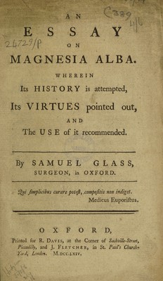 An essay on magnesia alba. Wherein its history is attempted, its virtues pointed out, and the use of it recommended / [Samuel Glass].