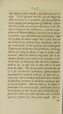 Credit: An essay on magnesia alba. Wherein its history is attempted, its virtues pointed out, and the use of it recommended / [Samuel Glass]. Source: Wellcome Collection.