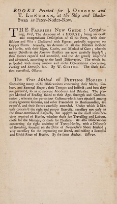 The farrier's dispensatory ... Containing first, a description of the medicinal simples commonly made use of in the diseases of horses ... Secondly, the preparation of simples ... Thirdly ... compositions and receipts suited to the cure of all diseases / [W. Gibson].