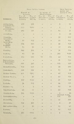 ![Prom Public Mains. Direct to houses. TOWNSHIP. No, of dwellinr- house s. No. of popul¬ ation. h Id in-li am. 277 935 Allithwaite Lower, lf].i 3 1 21 0 Allithwaite Upper. 212 721 Inperton. — — Biowith. — Broughton East. 27 1 03 Broughton W e st. 264 826 C artmel Pe 11. 18 58 Claife. 1 42 380 C olton. 16 70 C oniston. 289 900 Dunnerdale• — MU E pton-with- Newland, 111 326 Haverthwaite. 1 92 556 Hawkshead. 208 552 HoIker Lower. 401 : 1319 HoIker Upper. 8 38 Kirkby• 387 1 180 Lowick. 34 115 Mansriros. 1 5 0smotherley. 45 82 Pennington. 384 1170 Satterthwoite. — — Skelwith. — - Staveley. 1 22 327 S uhh e r t hw a i t, e. 9 30 Torver. — — Prom Private wells and By me a ns of sprinrs etc. stand- pipes. No. of No. of No. of O • O ^3 dwellin popui — : dwelling* - pop 111- h uise s, a t i 0 n. houses. a t i 0 n. — — \ 5 i 18 ; — — 2 5 — — 10 36 : — - 5 23 — — 37 117 - — 25 109 - — 39 137 - — 97 264 : — — 31 119 - — 302 1057 : 1 9 13 43 165 — — 61 190 — — 162 556 - - 55 269 — - 1 9 81 - - 46 163 - - 40 179 - - 41 197 — — 44 1 71 - — 1 0 50 : - - 46 156 — - 8 Privaet 33 Main. - - 1 06 336 : - - - 92 256 - — 6 21 - - 15 47 — - 60 196](https://iiif.wellcomecollection.org/image/b30200593_0007.jp2/full/800%2C/0/default.jpg)