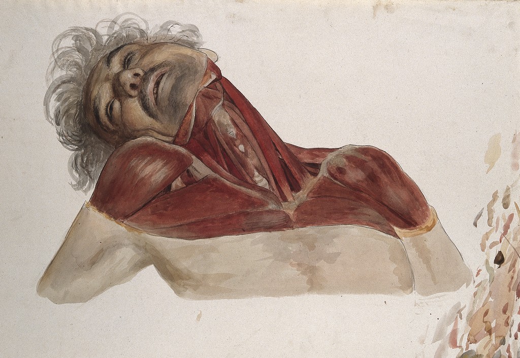 Credit: Partially dissected head, shoulders, chest and neck of a man, showing the deltoid and pectoralis muscles. Watercolour by J.C. Zeller, ca. 1833. Source: Wellcome Collection.