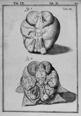 Credit: M0016908: Two diagrams of the structure of part of the brain, from Spiegel: <i>Tabulae anatomicae LXXXIIX</i>, 1632. Source: Wellcome Collection.