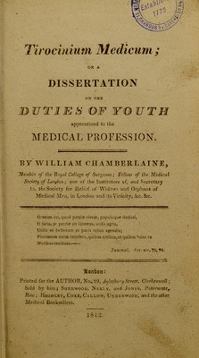 Tirocinium medicum; or a dissertation on the duties of youth apprenticed to the medical profession / [William Chamberlaine].