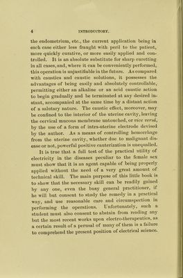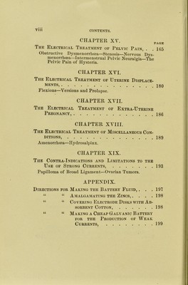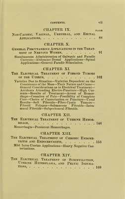 ![CHAPTER IX. ]Von-Caustic, Yaginal, Urethral, and Applications, PAGE Rectal ... 88 CHAPTER X. General Percutaneous Applications in the Treat- ment OF Nervous Women, 91 Simultaneous Administration of Galvanic and Faradic Currents—Abdomino-Dorsal Applications—Spinal Applications—General Faradic Stimulation. CHAPTER XL The Electrical Treatment of Fibroid Tumors OF THE Uterus, 102 Varieties Due to Situation—Varieties Dependent on the Consistence of the Mass—Tlieir Nature and Cause— General Considerations as to Electrical Treatment— Accidents Attending Electro-Puncture—High Cur- rents—Results of Treatment—Arrest of Hemor- rhage—Cessation of Pain—Possibility of Complete Cure—Choice of Cauterization or Puncture—Usual Results—Soft Fibroids—Fibro-Cystic Tumors— Fibroid Polypus—Submucous Fibroids—Intra- mural Fibroids—Subperitoneal Fibroids. CHAPTER XII. The Electrical Treatment of Uterine Hemor- ■ RHAGE, 146 Menorrhagia—Persistent Hemorrhages. CHAPTER XIII. The Electrical Treatment of Chronic Endome- tritis and Endocervicitis, 153 Mild Intra-Uterine Applications—Heavy Negative Cau- terizations. CHAPTER XIV. The Electrical Treatment of Subinvolution, Uterine Hyperplasia, and Pelvic Indura- tions,](https://iiif.wellcomecollection.org/image/b21724702_0013.jp2/full/800%2C/0/default.jpg)