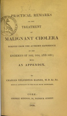 Practical remarks on the treatment of malignant cholera derived from the author's experience in the epidemics of 1832, 1834, and 1837 : with an appendix / by Charles Yelverton Haines.