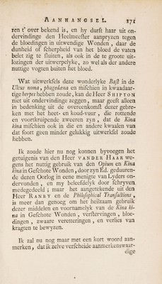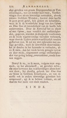 Credit: Verhandeling van de geschote wonden, samengesteld uit eige aanmerkingen en ondervinding ... / Uit het Fransch vertaald door H. Korp ... Door welken hier bygevoegd is een aanhangsel, strekkende ter aanpryzinge van het inwendig gebruik en voordeel van den opium en kina kina in geschote wonden en andere uitwendige gebreken, opgemaakt uit de Engelsche schriften van den Hr. Ranby, en van die der Koninglyke Maatschappy te London: als meede uit eige ondervinding. Source: Wellcome Collection.