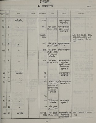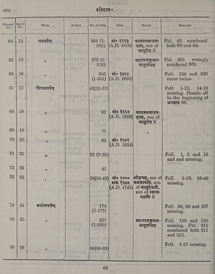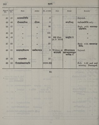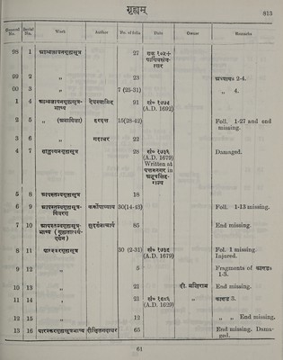 ![General No, 10 11 12 Serial No, CO2-—.Gd =] o> Or ope € bo La 10 11 813 Wort Author No. of folia Date | Owner | Remarks शराश्वलायनग्रह्यस्ुज | 27 | शक् १७५ पाथिवसंच- त्र 9) 23 प्रध्याय: 2-4. ” 7 (25-31) : , ॐ. 4. श्राश्वलायनयद्यस्च- | देवस्वाभिन् 91 | wo १७७६ भाष्य (A.D. 1692) » (आनाविला) | दर्दत्त (15(28-42) एना. 1-27 and end missing. a गदर 22 शद्धनयनगद्यस्ूच 28 | सं० २७३६ Damaged. (A.D. 1679) Written at पत्तननगर in छ्चूपसिद- राज्य ्रपस्तम्बगष्यसुत्र 18 | । द्मापस्तम्बगरद्यषु्- | कर्फोपाध्याय (30(14-485) Foll. 1-13 missing. विचरण प्रापस्तम्बगृदयसु्र- | BTA 85 End missing. भाष्य ( गृद्यतातरय- दसन ) पारर्ररगरद्यसूष 30 2-31)| सं ° १७३६ Fol. 1 missing. (A.D. 1679) Injured. + 5 | Fragments of काण्ड | 1-3. A 21 दी. ARITA | End missing. + 91 xo १६८६ ” SIs 3. (A.D. 1629): : 12 » 9», Gnd missing. पारस्करगर्यस्तुचभाष्य (+र 65 | | ise missing. Dama- 1-1-00 ~~](https://iiif.wellcomecollection.org/image/b32882099_0079.jp2/full/800%2C/0/default.jpg)