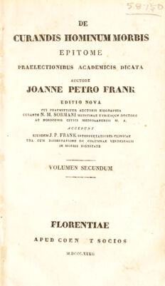 De curandis hominum morbis, epitome praelectionibus academicis dicata / Ed. nova cui praemittitur auctoris biographia curante N.M. Sormani. Accedunt ejusdem J.P. Frank Interpretationes clinicae una cum dissertatione de columnae vertebralis in morbis dignitate.