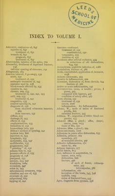 ![1 ABDO>tEX, contusions of, 847 injuries of, 847 treatment of, 851 wounds of, 852 prognosis, 857 treatment of, 857 Abercrombie, injuries of the spine, 769 Abernetliy, treatment of depressed fracture, 736 valvular opening of abscesses, 241 Abiogenesis, 165 Abscess {absccdo, I go away), 232 acute, 232 treatment of, 239 antiseptic treatment of, 245 aspirator used in, 238 blood-vessels affected by, 235 caustics in, 243 chronic, 209, 233 treatment of, 240, 241, 243 cold, 209, 233 treatment of, 241 congestive, 235 counter-opening in, 241 diagnosis of, 236 from encysted sebaceous tumours, 969 from tumours, 237 diffuse, 233 drainage of, 243 effects of, 235 emphysematous, 235 formation of, 232 lia-morrhagc into, 251 Hilton's method of ojiening, 241 incision into, 240 injection of, 243 lymphatic, 235 metastatic, 233, 947 jnultilocular, 235 plegmonous, 232  pointing  of, 232 potassa fusa in, 243 pressure-effects of, 235 prognosis of, 238 puerperal, 233 pyiBuiic, 233, 947 scrofulous, 1064 secondary, 947 seton in, 243 subcutaneous strumous, 1054 situation and size of, 235 structure of, 232 subpectoral, 829 tapping of, 242 Abscess—coniin ucd. treatment of, 239 constitutional, 250 - tympanitic, 235 varieties of, 232 Accidents after arterial occlusion, 434 in reductions of old dislocations, 634, 656 Accoucheurs, syphilitic infection of, 1088 Acetabulum, fracture of, 586 Acids, concentrated, application of, in cancer, 1038 Acinous adenomata, 995 Aconite in inflammation, 200 Acromion, dislocation of, from clavicle, 644 fracture of, 566 Active or acute infiamuiation, 147 Acui'KEssuiiE, {acus, a needle ; prcmo, I press), 425 compared with ligature, 427 condition of artery after, 427 Acute abscess, 232 treatment of, 239 cancer, 1006 inflammation. See Inflammation Adams, W., mode of union of fractured patella, 609 ununited fracture, 545 Addison, W., migration of white blood cor- puscles, 153 Adenoid {6.^r)v, a gland; «l5oy, shape), cancer, 1009, 1033 tissue of His, 990 Adenoma {&5r]v, a gland), 994 Adeno-sarconiata, 1006 Adhesions in joints after dislocation, 633 Adhesion, ])rimary, 269 secondary, 277 of wounded arteries, 397 Adhesive inflammation, 171 union by, 269 Adipose tumours, 977 Aerial fistula, 813 Age, influence in amputation, 74 cancer, 1012, 1013 dislocation, 626 fractiu-e, 496 of neck of femur, extracap- sular, 593 intracapsular, 588 inflammation, 160 laceration of the brain, 747, 748 syphilis, 1095 union of fractured bone, 545 Ague, diagnosis from pyjemia, 956](https://iiif.wellcomecollection.org/image/b21536867_1159.jp2/full/800%2C/0/default.jpg)