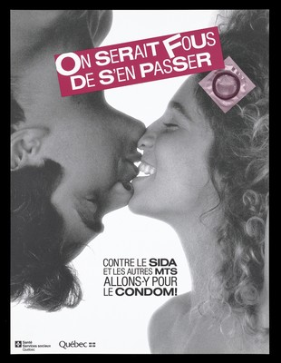 Credit: A man upside down kisses a woman, with a condom; advertisement for safe sex to prevent AIDS by Santé Services sociaux Québec. Colour lithograph. Source: Wellcome Collection.