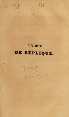 Un mot de réplique à un réquisitoire du Ministère Public [issued by J.L. Langlois], sur cette question: Les médicins attachés aux bureaux de charité, peuvent-ils ... être dispensés du service ordinaire de la garde nationale? / [Paul Jolly].