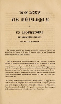 Credit: Un mot de réplique à un réquisitoire du Ministère Public [issued by J.L. Langlois], sur cette question: Les médicins attachés aux bureaux de charité, peuvent-ils ... être dispensés du service ordinaire de la garde nationale? / [Paul Jolly]. Source: Wellcome Collection.