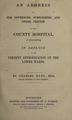 An address to the governers, subscribers, and other friends of the County Hospital at Winchester, in defence of the present appropriation of the lower wards / by Charles Mayo.