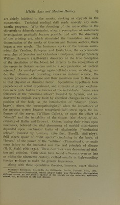 ![Early History. yet in a large measure it remained in its primitive condition m the hands of sbepherds and farmers. At the beginning of our present era medicine was chiefly domi- nated by the teacbings l'ormulated by Hippocrates and Aristotle in tlieir general writings. The stndy of comparative natural Science, instituted by Aristotle, laid the foundation of our knowledge of animal biology, of comparative anatomv and plrysi- ology; while Hippocrates and after him the physicians of his school established pathology. At that time it was held that tliere were in the animal and human bodv four Cardinal humors, ‘‘blood, mucus, and yellow and black bile. ’ It was taught that a proper relationship between these (crasis) insured health; and that dis- ease depended upon the occurrence of lack or excess of one or other, that is upon some modification of tlieir relationship (dys- crasis). Next to the blood, the principal vital humor, Hippocra- tes placed mucus in order of importance, because it is often dis- charged in large quantities from the nose and was thought to come from the brain and to escape through the ethmoidal open- ings. Yellow bile was often seen in vomit; but black bile was entirely a product of the imagination and was supposed to arise in the spieen. The basis of vital phenomena was supposed to’ be the inspired air (pneuina, the breath of life), which was thought to contribute warmth to the bodv. In conformity with the accepted thcory of corruption of the humors, therapeutic measures were directed to a riddance from the System of the ma- terial which had caused the “dyscrasiaand for this reason evacuants, diaphoretics, diuretics and venescction plaved an im- portant part in those times. The importance which Hippocrates ascribed to these fluids or humors led to the application by later generations of the name Humoral Pathology to this System. The solid structures of the body were not entirely disregarded, but only vague ideas prevailed in relation to them. There was a theory (Democrites) that the solid parts were made up of particles known as atoms, between which there were pores [for the passage of air and humors], that the width of these pores varied with the varying density of deposition of the atoms, and that by some such method the state of the body was regulated. To this extent, therefore, there was a Solid Pathology, which, however, found but few adherents. Efforts toward such theoretical explanations found Support particularly in the schools of philosophy; and tenacity of such views and the rigid](https://iiif.wellcomecollection.org/image/b28130078_0031.jp2/full/800%2C/0/default.jpg)