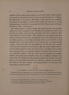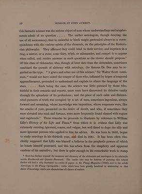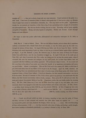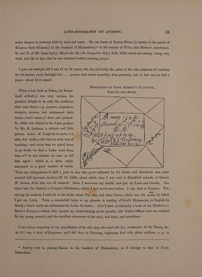Memoir of John Aubrey, F.R.S.; embracing his autobiographical sketches, a brief review of his personal and literary merits, and an account of his works, with extracts from his correspondence, anecdotes of some of his contemporaries, and of the times in which he lived / By John Britton ... Published by the Wiltshire Topographical Society [with its 5th Annual Report, 1845].