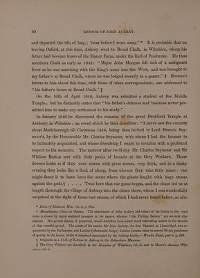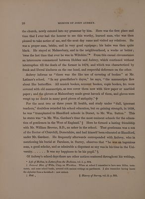 Memoir of John Aubrey, F.R.S.; embracing his autobiographical sketches, a brief review of his personal and literary merits, and an account of his works, with extracts from his correspondence, anecdotes of some of his contemporaries, and of the times in which he lived / By John Britton ... Published by the Wiltshire Topographical Society [with its 5th Annual Report, 1845].