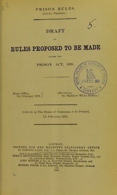 ![■ PRISOIS RULES. (Local Prisons.) DRAFT RULES PROPOSED TO BE MADE UKDEB THE Ordered, h]/ The House of Commons, to he Printed, 1th Februaru 1899. LONDON: PRINTED FOR HER MAJESTY’S STATIONERY OFFICE; By darling & SON, Ltd., 1-3, Geeat St. Thomas Apostle, E.C. And to be purchased, either directly or through any Bookseller, from EYRE & SPOTTISWOODE, East Haedino Steeet, Fleet Steebt, E.O., and 32, Abingdon Steee7, Westminstee, S.W. ; or JOHN MENziES & Co., 12, Hanovee Steeet, Edinbijeqh, and 90, West Nile Steeet, Glasgow ; or HODGES, FIGGIS, & Co., Limited, 104, Geapton Steeet, Dublim. 1899. r 2,](https://iiif.wellcomecollection.org/image/b22333782_0003.jp2/full/800%2C/0/default.jpg)