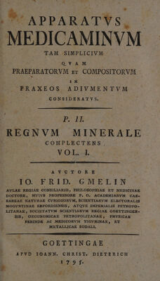 Apparatus medicaminum tam simplicium quam praeparatorum et compositorum in praxeos adjumentum consideratus. P. II. Regnum minerale complectens / [Johann Friedrich Gmelin].