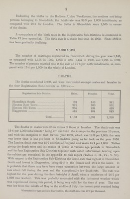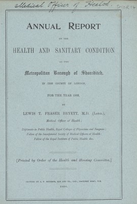 ![Medical officer of Health SHOR 14 Annual Report ON THE HEALTH AND SANITARY CONDITION of the Metropolitan Borough of Shoreditch, IN THE COUNTY OP LONDON, FOR THE YEAR 1903, BY LEWIS T. FRASER BRYETT, M.D. (Lond.), Medical Officer of Health; Diplomats in Public Health, Royal Colleges oj Physicians and Surgeons; Fellow of the Incorporated Society of Medical Officers of Health; Fellow of the Royal Institute of Public Health &c. [Printed by Order of the Health and Housing Committee.] printed by a. t. roberts, son and co., ltd., hackney road, n.e. 10 4 .](https://iiif.wellcomecollection.org/image/b19822054_0001.jp2/full/800%2C/0/default.jpg)