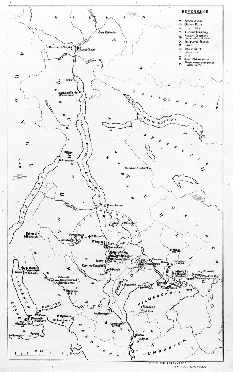 M0016013: Map showing ecclesiastical sites in Loch Lomond surveyed and described by A. D. Lacaille between 1919 and 1933. In copyright. Source: Wellcome Collection.