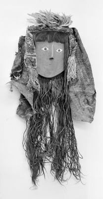 Credit: M0019348: Two Peruvian ceremonial masks with headdresses of orange feathers: front view. Source: Wellcome Collection.