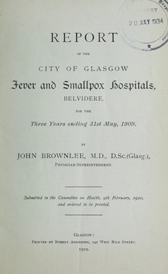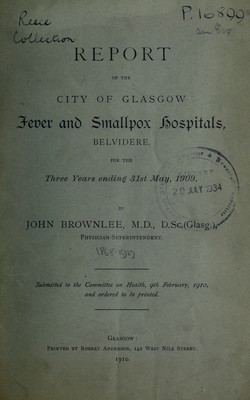 Report of the city of Glasgow fever and smallpox hospitals, Belvidere, for the three years ending 31st May, 1909 / by John Brownlee.