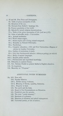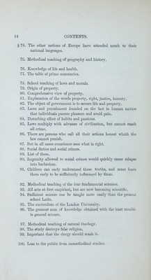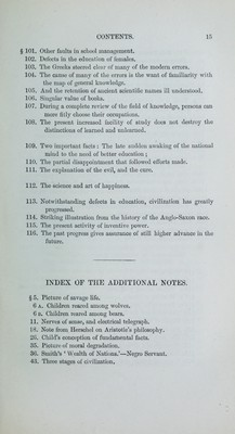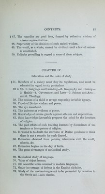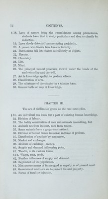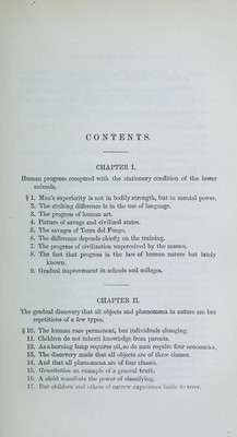 ![CONTENTS. CHAPTER I. Human progress compared with the stationary condition of the lower animals, § 1. Man’s superiority is not in bodily strength, but in mental power. 2. The striking difference is in the use of language. 3. The progress of human art. 4. Picture of savage and civilized states. 5. The savages of Terra del Fuego. 6. The difference depends chiefly on the training. 7. The progress of civilization unperceived by the masses. 8. The fact that progress is the law of human nature but lately known. 9. Gradual improvement in schools and colleges. CHAPTER II. The gradual discovery that all objects and phsenomena in nature are but repetitions of a few types. § 10. The human race permanent, but individuals changing. 11. Children do not inherit knowledge from parents. 12. As a burning lamp requires oil, so do men require four necessaries. 13. The discovery made that all objects are of three classes. 14. And that all pliEenomena are of four classes. 15. Oravitation an exam])le of a general truth. 16. A child manifests the power of classifying. 17. Rut children and others of narrow experience liable to error.](https://iiif.wellcomecollection.org/image/b24974420_0019.jp2/full/800%2C/0/default.jpg)
