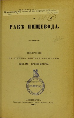 Izsliedovaniia o rakie pishchevoda : dissertatsiia na stepen' doktora meditsiny / Nikolaia Kruzenshterna.