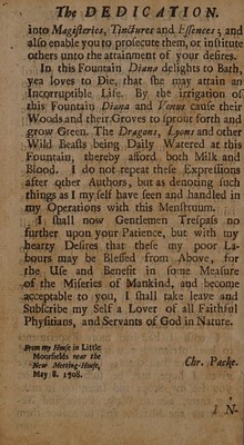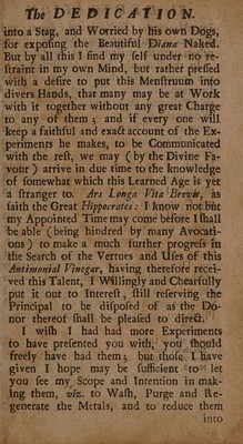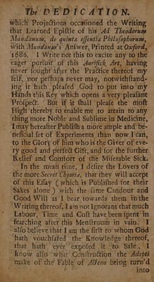 Credit: Medela chymica: or an account of the vertues and uses of a select number of chymical medicines adapted to the cure of the most chronick and rebellious diseases. To which is subjoyned a brief history of cures effected by them : As also, an essay upon the Acetum acerrimum philosophorum, or vinegar of antimony. With some experiments made therewith / by Christopher Packe. Source: Wellcome Collection.