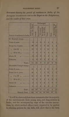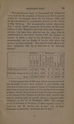![“ The convalescent depot at Ootacmund was announced to be ready for the reception of European invalids,in general orders by Government dated the 8th January 1830; and the first detachment of convalescents arrived at the station in May following. The accompanying tabular statements, Nos. 1 and 2, exhibit separately the number of European soldiers, of Her Majesty’s, and of the Honorable Company’s services, who have been admitted into the depot from its establishment, to the end of October 1832; the diseases on account of which a trial of the Neilgherry climate was recommended; and the degree of success with which the measure has been attended. ‘The general results afforded by these statements, will be at once seen in the following abstract.” a Admitted. Discharged. . — ss 3 #8. io, an |3 1] [8 le mie Su bae eae sees iS |s ic) S ID 318 © BS 2jo\6| . sie cles] = |e & slalals ie felgel s ise = == A ot on} SAI OAs) 6 al a! Of Her Majesty’s Service...; 35 30/10 75) 42 ; 3 53| 6, 16 | Ofthe Hon. Compy’s service.| 18! 30)15) 63/33; 3! 11} 47) 4) 12 Total. . a 60/25) 188|75 a 14} 100110} 28 “ It thus appears that of 138 men, of both services, received into the depot, 75 have been restored to good health, and were sent to rejoin their respective corps; 11 though not cured have been so much benefited as to be considered fit to return to duty; 14 have been discharged from the depot as incurable in the climate of the Neilgherries,10 have died; and 28, (the majority of whom had but recently joined,) continued under treatment on the ist of November, 1832. The average period of detention in the depot, of those reported cured or improved, was 10 months and 4 days; and of those discharged as incurable, 12 months and 11 days.” E](https://iiif.wellcomecollection.org/image/b29346885_0043.jp2/full/800%2C/0/default.jpg)