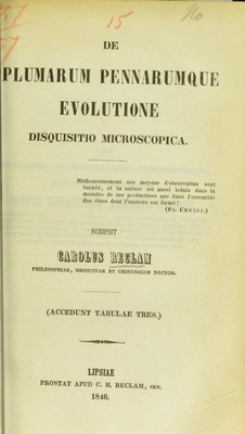 De plumarum pennarumque evolutione disquisitio microscopica / scripsit Carolus Reclam.