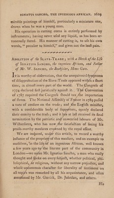 ![His letters have been publifhed, one of which, addreffed to Sterne on the depreffed date of perfonal ilavery in the colonies, can never be too often read by the admirers of fympathetic writing. The writer of this article has the fa- tisfa&ion to obferve, that this uncommon character, after confide, able reading, and much reflexion taken up in a (fate fervitude, died a determined friend to genuine chriftianity, of in its true fpirit and practice. A portrait of him, engraved by the celebrated Bartolozzi, is prefixed to his letters, which are in two vols. 8vo. His fon, Mr W. Sancho, was * brought up to the profefiion of a bookfeller by Mr. Edward Jeffery, of Pall-Mail, and at prefent is the worthy fucceffor of Mr. Henry Paine at the Mews Gate in Caftle-ftreet. He is alfo, we believe, librarian to Sir Joleph Banks, and col- lects literary curiofities with the mod unwearied diligence. Memoirs of Mr. John Sewell, the late remarkable Bookfeller in Cornhill. , Jr Extracted from the European Magazine. ]VIr. John Sewell was born at Oakham in Rutland- (hire; we prefume, in 1735 ; as we find he was baptized on July the 27th of that year. Of his family wc know no particulars; but learn that he came to London in 1752, and became the apprentice of Mr. James Brotherton, who after¬ wards received him as a partner; and that connexion con¬ tinued till 1775, when Mr. Brotherton died, and left Mr. Jr Sewell the whole of his property, with the exception only of a legacy of 30I. to an elderly lady. Mr. Brotherton was an eccentric fort of man; and Mr. Sewell certainlyinherited, with his fhop and bufinefs, fome of his harml6fs whimficality. When, in 1779, he was chofen conftable for the ward of Cornhill, it was expected that](https://iiif.wellcomecollection.org/image/b31970370_0008.jp2/full/800%2C/0/default.jpg)